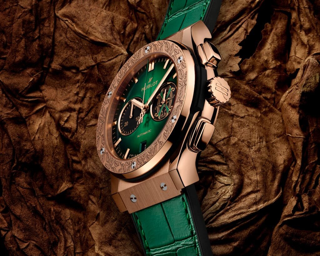 ساعة كلاسيسك فيوجن كرونوغراف آرثر فوينتي كينغ جولد المميزة والمشرقة، التي تحتفل بإنجاز تاريخي مهم لأحد الأسماء الأكثر احترامًا وتقديرًا في عالم السيجار الفاخر، تستحق عرضًا خاصًا يعكس أهميتها الاستثنائية. تم تقديم هذه الساعة الفاخرة في علبة ساعة كبيرة ومبهرجة بلون أخضر لامع، لا تقتصر مهمتها على حماية الساعة فحسب، بل تعمل أيضًا كخزانة سيجار. تم تصميم هذه العلبة المبتكرة بعناية وبتعاون وثيق مع ماني إيريارتي، الشريك الإبداعي الطويل الأمد لعائلة فوينتي، الذي شكلت رؤيته الفنية العديد من الإبداعات الأيقونية لهذه العائلة على مر السنين. يجمع تصميم العلبة بين الفخامة الواضحة والوظيفة العملية، مما يضيف طبقة إضافية من الأناقة والرفاهية لهذه الساعة المدهشة، مما يجعلها تجربة أكثر تميزًا لصاحبها.