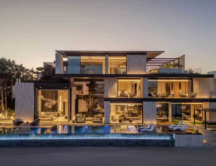 Set on a plot of over 15,000 square feet with a built-up area of 12,554 square feet, the villa spans multiple levels with five en-suite bedrooms, each featuring private walk-in closets and terraces that offer stunning views of the crystal-clear Arabian Gulf and the glittering Dubai skyline. An entertainer’s paradise, the villa includes a basement parking for 6 to 8 cars and a myriad of entertainment options including a serene Spa, a VR gaming area, a DJ booth with a Karaoke stage, a car simulator, and much more, ensuring that every moment spent here transcends the ordinary.